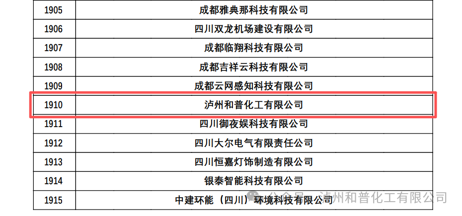 近日,全国高新技术企业认定管理工作领导小组办公室发布《对四川省认定机构2025年认定报备的第四批高新技术企业进行备案的公示》,泸州和普化工有限公司顺利通过“高新技术企业”认定。
